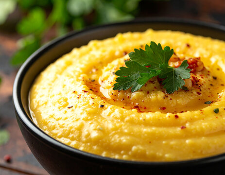 A close-up of Xima (thick corn porridge), a smooth, starchy mound, served with a rich, savory vegetable or meat sauce.