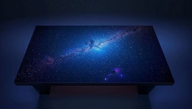 Futuristic flat-panel table projecting milky way starfield on surface with blue lighting