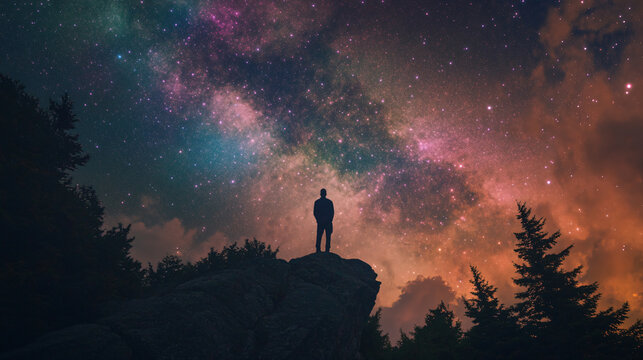 Cosmic cowboy stargazer under starry night sky