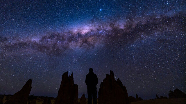 Man in the Pinnacles (Western Australia) looking up at the Milky Way as it slowly descends in the nights sky.