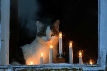 Domestic cat sitting behind a window, staring outside