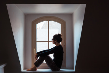 Thoughtful woman relaxing on cozy window seat
