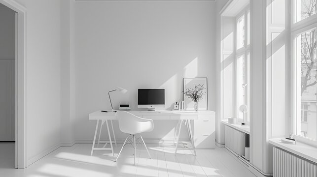 Minimalist office with stark white decor, highlighting a clean, focused environment for high productivity