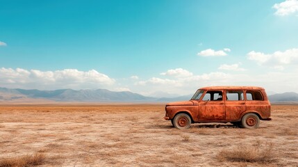 A weathered vintage car, rusted and abandoned, stands solitary amidst a desolate arid terrain, evoking nostalgia and the passage of time under an open sky.