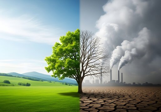 The stark contrast between a healthy, green environment and a polluted, industrial landscape