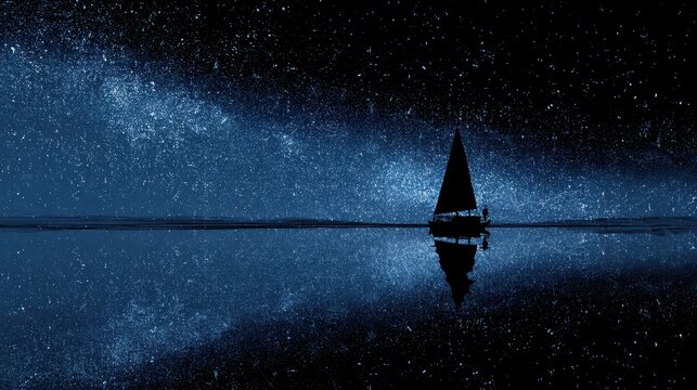 Solitary sailboat glowing on calm ocean reflecting stars under vast night sky
