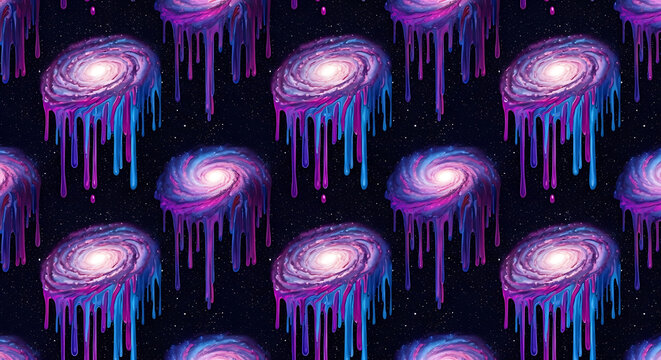 Seamless pattern of dripping galaxy illustrations on a dark starry background repeat design effect