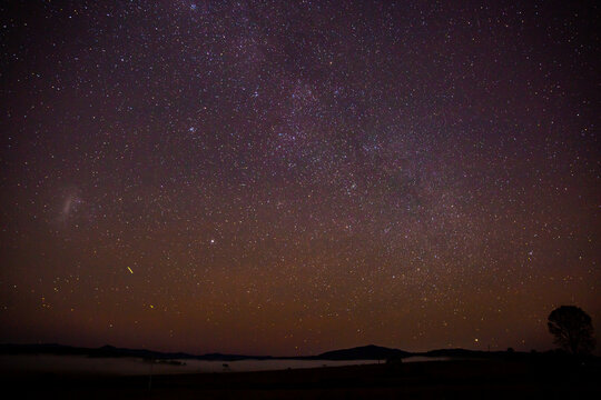 Lone oak tree in a large field shot at night with the Milky Way stars galaxy in the sky