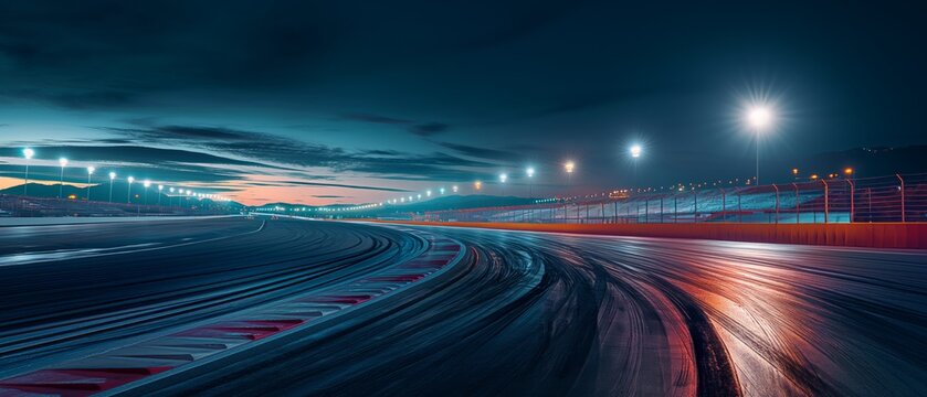 Wide perspective of an empty international race track with start and finish line in the morning