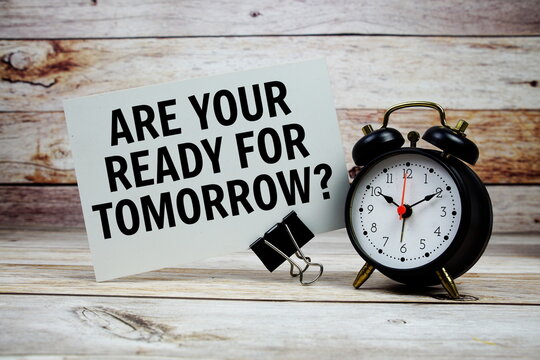 Are your ready for tomorrow? text on paper card with alarm clock on wooden background