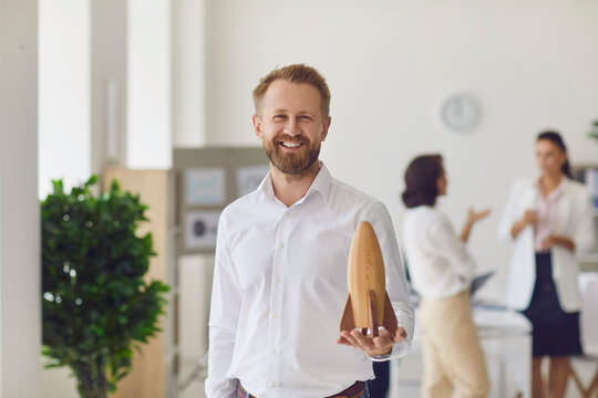 Happy smiling business owner looking at camera and holding wooden rocket as symbol of new start-up