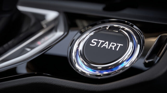 Macro image of engine start button, reflective chrome trim surrounding illuminated lettering, sleek dark dashboard emphasizing modern design