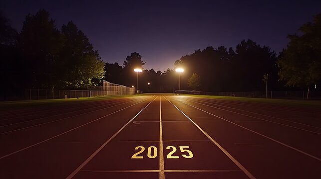 A wide view of a brightly lit athletics track at night, with "2025" engraved near the starting point