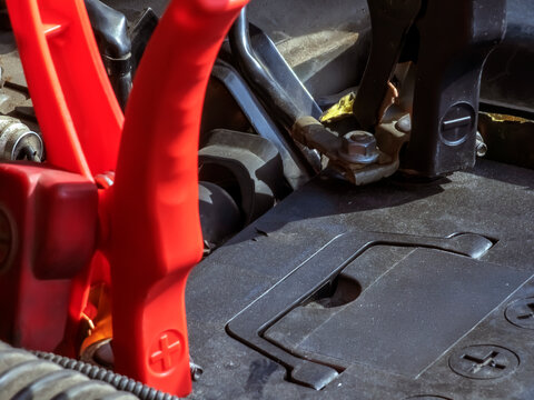 Close-up of car charger cable jump starting a dead car battery. Red charging cable clamps on battery terminals for charging, car repair and the maintenance concept.