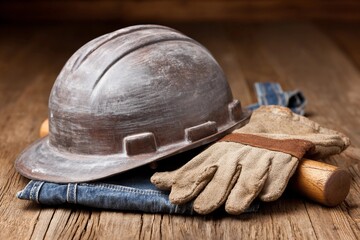 Closeup of a cleaning lady holding a bucket full of cleaning supplies, ready to start her work in a modern office with large windows and bright light