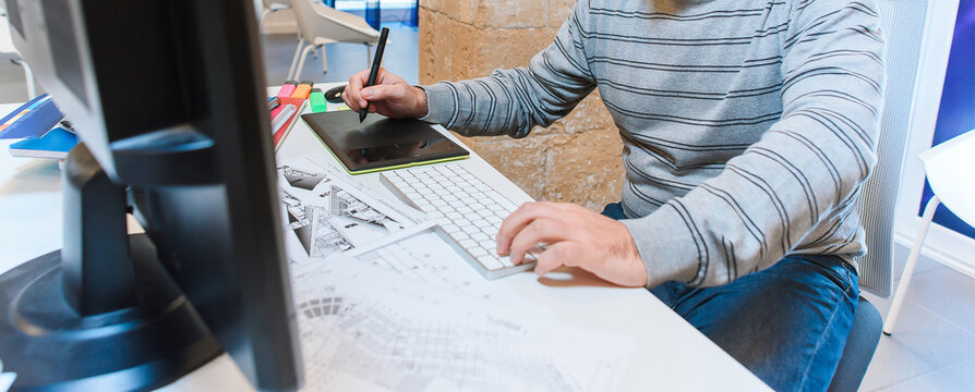 Focused professional writing notes at coworking desk with tablet and monitor