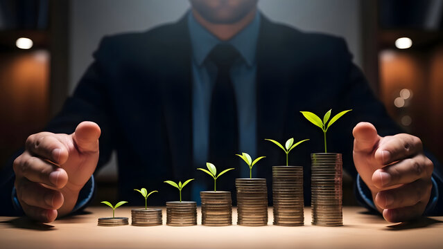 startup investment growth ecosystem concept. Vibrant plant growing amidst glowing stones in a dark background.