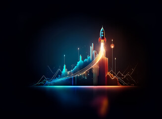 Neon rocket launching from a vibrant, glowing graph against a dark backdrop.  Digital lines and bright colors illustrate upward growth and success.