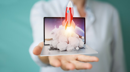 Businesswoman with rocket launching from a laptop 3D rendering