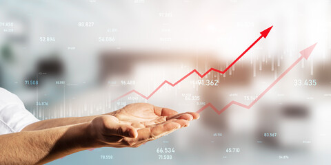 Financial goal and sales targeting concept with a male hands presentation virtual economy diagram with red upward arrow on a digital display hologram, on a blurred office background
