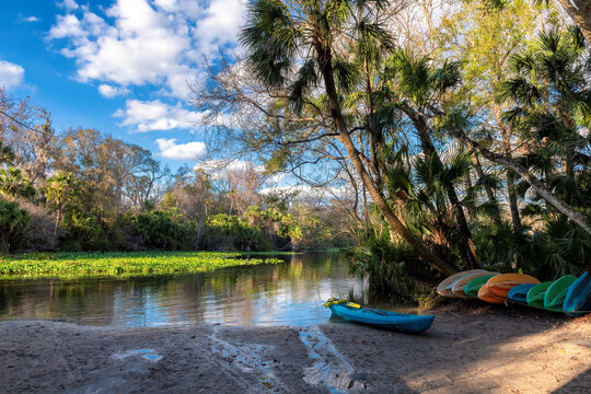 Colorful canoes by lake surrounded by tropical trees at sunset in Wekiwa Springs State Park, Florida
