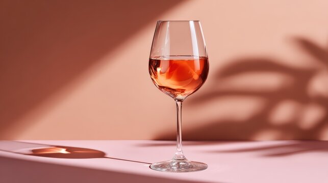 Glass of Rosé Wine with Tropical Shadow on Pink Background
