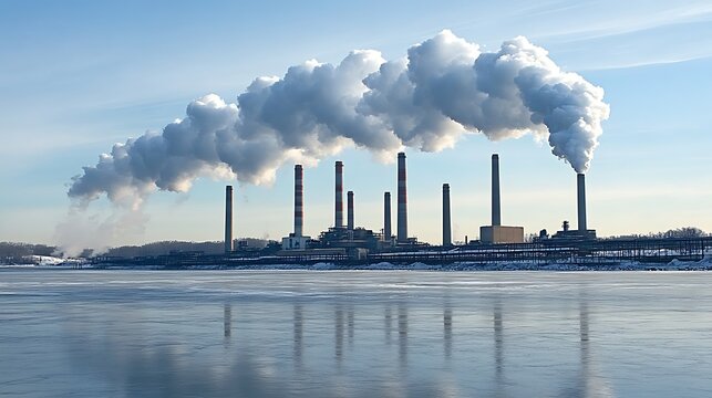 Industrial Twilight: A serene waterfront scene depicts an industrial skyline bathed in the soft hues of twilight, with billowing smoke from factory chimneys reflecting in the still water below.