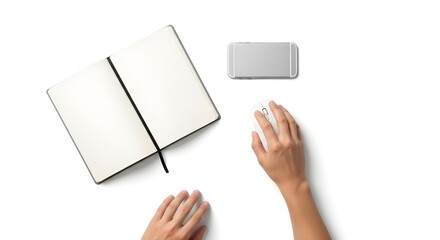 Resting Hands After Typing on Minimal Workspace, Technology Flat Lay, White Background, Mockup Loop, Top-Down View