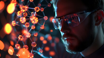 Photography of a researcher examining a 3D molecule structure with 2D statistical data, merging science with analytics, 4k resolution, Plain background