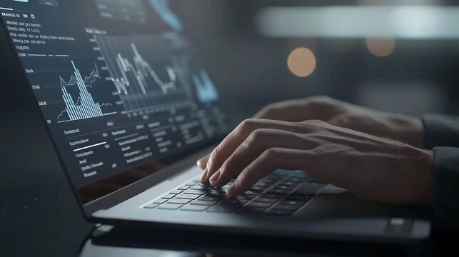 Close-up of a financial analyst's hands working on a calculator while reviewing graphs and charts on statistical reports.