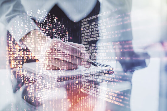 Double exposure of abstract digital world map and hand writing in notepad on background with laptop, big data and blockchain concept
