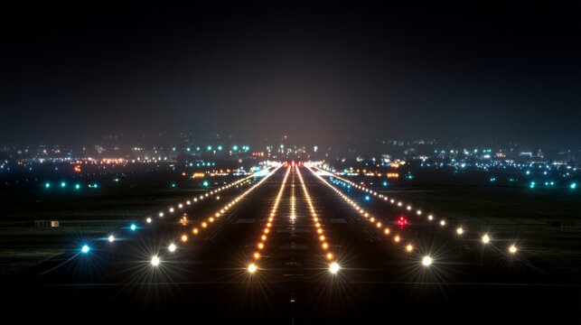 Air traffic control operation airport runway nighttime photography urban environment aerial view aviation safety