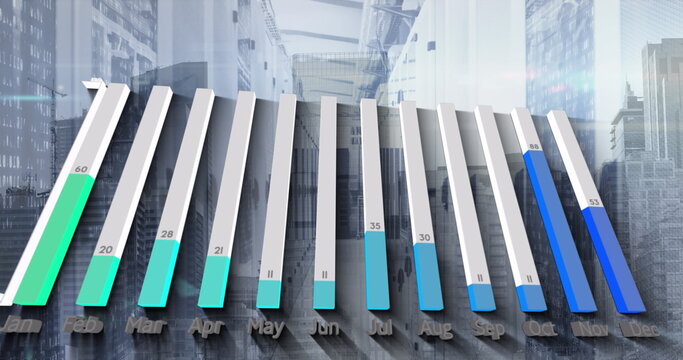 Image of statistical data processing over tall buildings in background