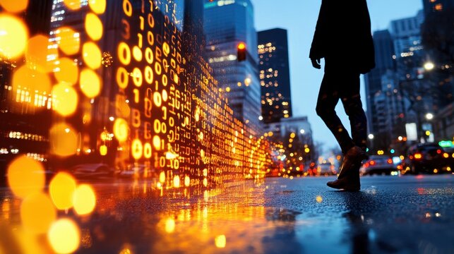 Futuristic urban finance with data visualization overlaid on skyscrapers