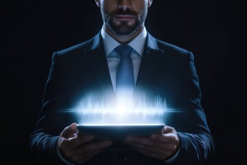 A businessman in a business suit, holding a tablet with a transparent holographic chart showing upward trends, statistical data, and stock market insights floating in the air.