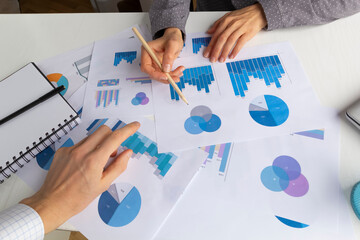 Close-up of a financial analyst's hands working on a calculator while reviewing graphs and charts on statistical reports.
