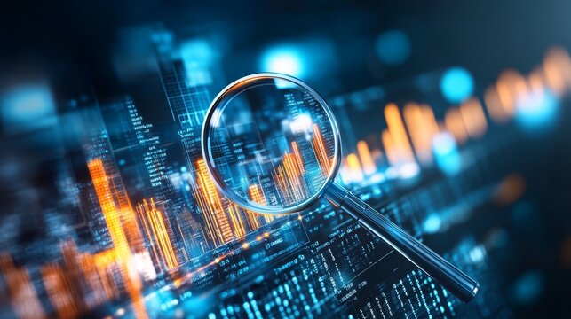 Magnifying Glass on Data and Charts with Blue and Orange Glows