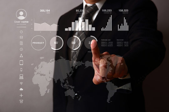 Smart financial analytics working at modern office with big data ,connections icon, internet of things, financial charts and graph virtual screen.