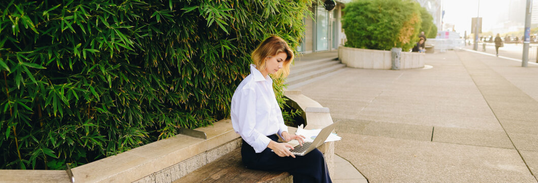 Female statistician working with color diagrams and laptop outdoors near green plant. Concept of working with theoretical or applied statistics. Young woman wears business clothes.