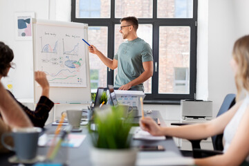business, people and corporate concept - team of startuppers with statistics on flip chart working at office