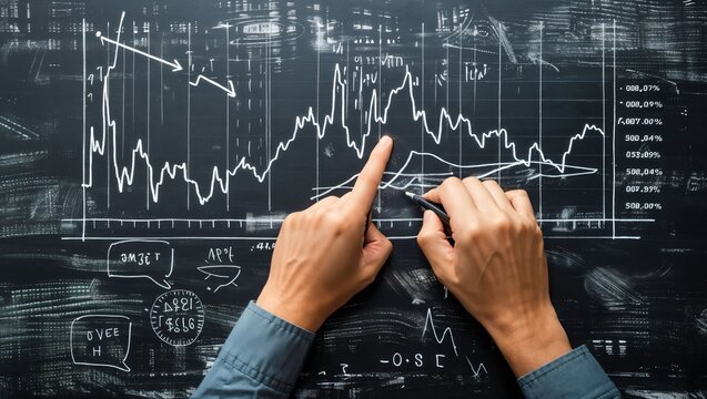 Hands pointing and drawing on a chalkboard filled with various graphs, lines, and chart elements representing data analysis and market trends in a drawn style.