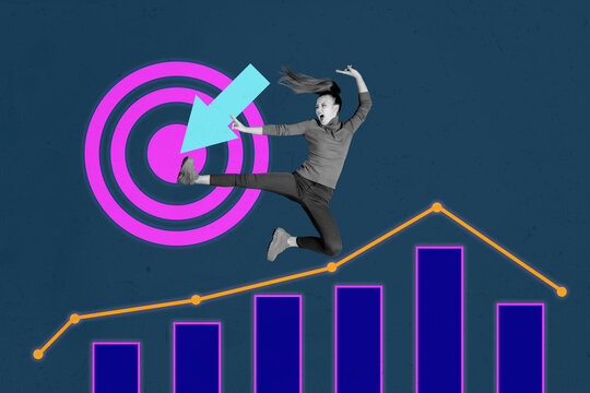 Banner 3d sketch image trendy collage of happy businesswoman jump graph chart statistics target arrow development progress