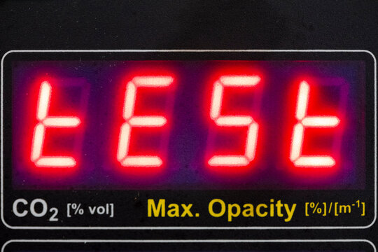 Emissions analyzer digital display showing operational status with CO2 and opacity measurement indicators