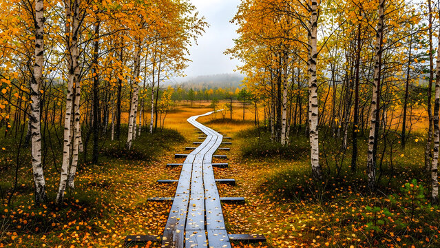 A serene autumnal forest pathway with wooden planks leading through vibrant yellow trees