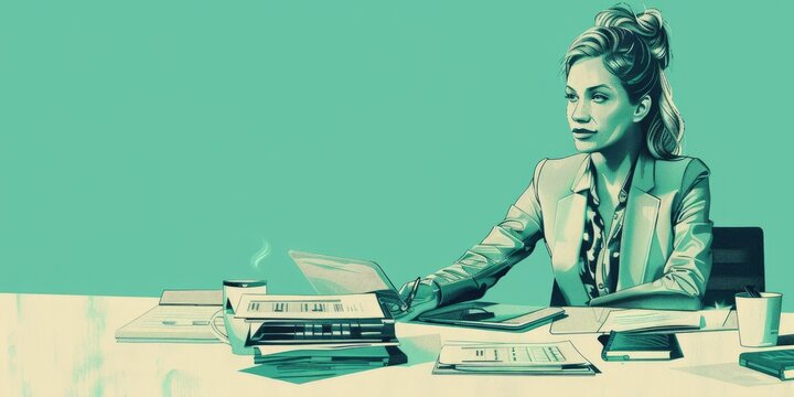 The photo shows a woman sitting at a desk, looking at a document. She is wearing a suit and has her hair in a bun. The background is a light blue color.