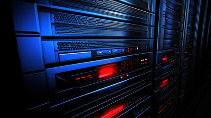 High tech server rack with glowing red status lights and blue ambient lighting