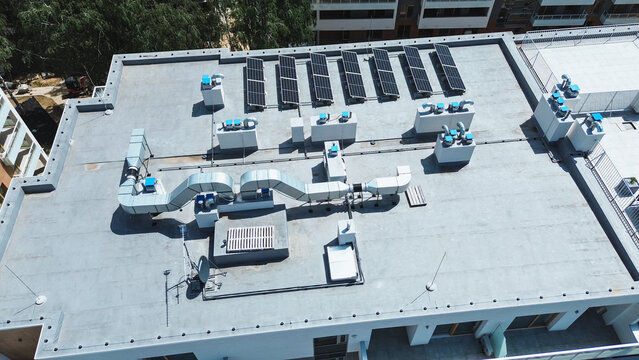 Hvac equipment and solar panels are installed on the rooftop of a modern apartment building, providing climate control and renewable energy