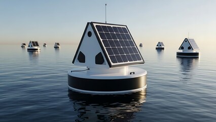 Solar panels floating on calm water with several buoys renewable energy sustainable