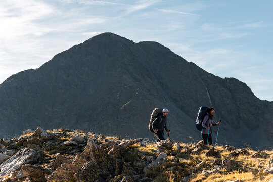 Close-up of feet on a mountain path, moving steadily towards the summit.