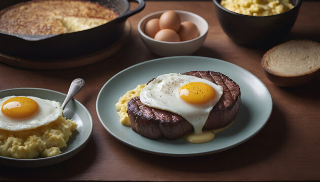 Fried eggs and steak in stainless steel pan, accompanied by fresh broccoli, create delicious and nutritious meal. vibrant colors and textures evoke sense of satisfaction and culinary delight